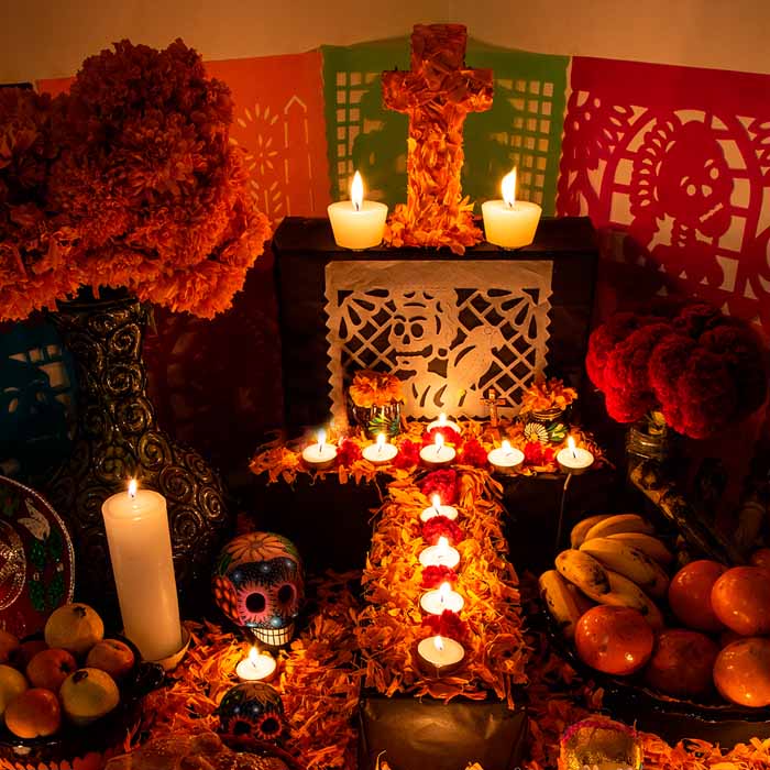 A la maison ou au cimetière, illuminé par des bougies, afin que les êtres chers disparus puissent leur rendre visite.