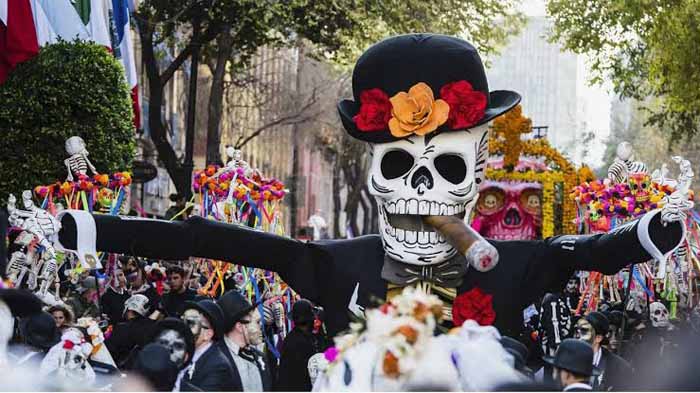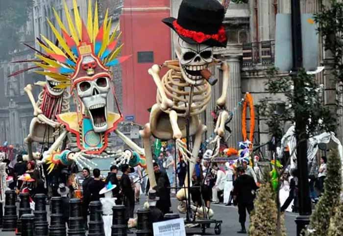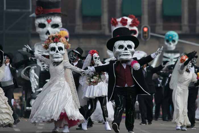 D’énormes crânes et squelettes montés sur des chars et des personnes masquées et costumées défilent dans la rue, rythmés par une musique joyeuse traditionnelle du « Jour des Morts ».